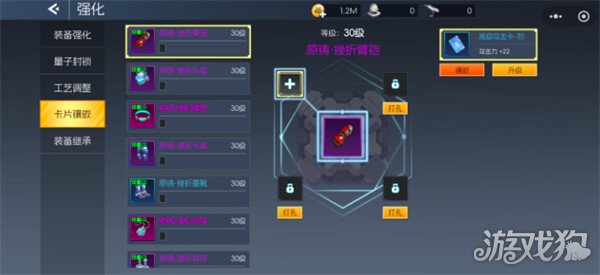 第四部分是卡片镶嵌,也是卡片晶核最常用到的部分,玩家可以在卡槽内镶嵌进不同属性的卡片,不仅可以通过卡片升级来达到更强的效果,而且通过晶核的加持,能够让卡片自身养成数值得到高效突破。(小提示:卡槽数量有限,要想获得更多槽位,需要钻孔机;对于卡槽内已存在卡片时,如果想替换卡片,玩家需要在游戏当中解锁超声取卡器,因此镶嵌卡片要谨慎哦!)