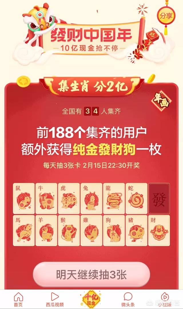 今日头条采取了一个小小的策略,前188名有额外赠送,然而,想集齐全部却不容易,所以能调动大家的积极性。活动时间为2月8日至2月15日,如果第一天就有100多万人集齐的话,那么接下来的日子就是等待开奖,那么这个活动就太失败了。所以为了让所有人玩起来,不会太容易集齐。