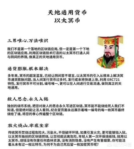不知道最近听没听说过“比特冥币”?那个挺好的,他的家人可是尝试买一点儿,前提是他留下了公匙和私匙,提出来他的比特币然后全部换成这种以太冥币,听说它有烧币系统,可以烧给古人。