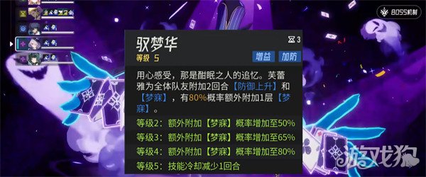 这个增益是给我方带来的效果,而减益给敌方带来的效果基本都是跟双方的行动进度有关的,而她的第二个技能叫做驭梦华,月梦华这个技能是可以带来全体队友增加增益效果的,所以芙蕾雅是非常适合放在辅助增益位置上使用的一个角色,她使用玉梦华的时候可以给全体的队友来附加两个回合的增益效果,这里的增益效果体现在防御上升的数值以及梦寐的效果上面,且在同时还有80%的几率可以额外附加一层的梦寐,再给自己的队友增加增益。