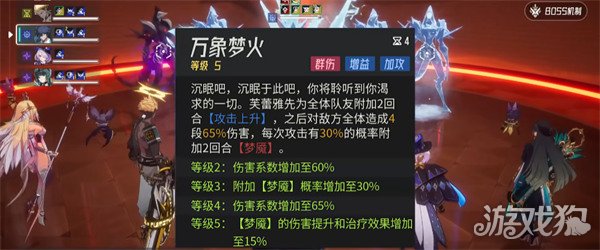 她的大招叫做万象梦火,这个技能使用的时候,她先会做出一个攻击上升的增益,并且是给全体的队友都带来两个回合提升的之后,还有一个增益是额外的触发效果,是给敌方的全体带来一个4段的连击伤害,这里4段造成的伤害是65%的数值,而且四段当中,每一次的攻击都会有30%的概率,可以附加给敌人一个梦魇的影响效果,后期她在潜能上面如果得到基础属性提升的话,还可以给自己的攻击、防御以及生命数值都提升5%的提升,所以有潜能效果的时候,她自身的能力会更好用。