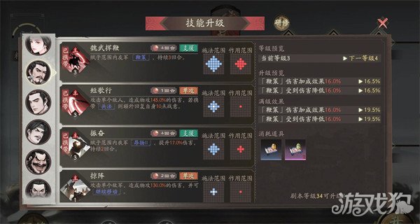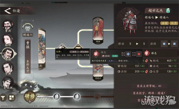 我们搞定阵容之后就要注意一下技能加点了,推荐大家先点群雄线的魏武挥鞭,他能造成范围伤害附加16%增伤和减伤,是开荒期核心buff,然后就点出天下归心(重骑兵线),唯一光环技能提升菱形2格内战法伤害10%。仕途的话可以先把重骑兵线解锁到40级拿天下归心,再补群雄线魏武挥鞭,最后点雄志(超世之杰)弥补天赋兵法持续时间不足,这个技能加全队10%攻防,能和天赋叠加用。