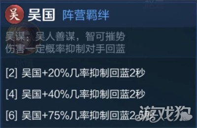 游戏当中吴国的羁绊通常不是最为强势的,但却是游戏中针对性最强的羁绊。凑齐6位吴国阵营的角色,那么吴国角色在对敌人造成伤害的时候,就有75%的概率抑制敌人的蓝量回复持续2.5秒钟。该羁绊虽然在游戏起初效果并不明显,咋一看并不如蜀国和魏国的羁绊效果,但是随着战斗时间的持续增加,当敌人的蓝量消耗一空时,或者应对法师多的阵容,吴国的羁绊却是非常强大的存在。