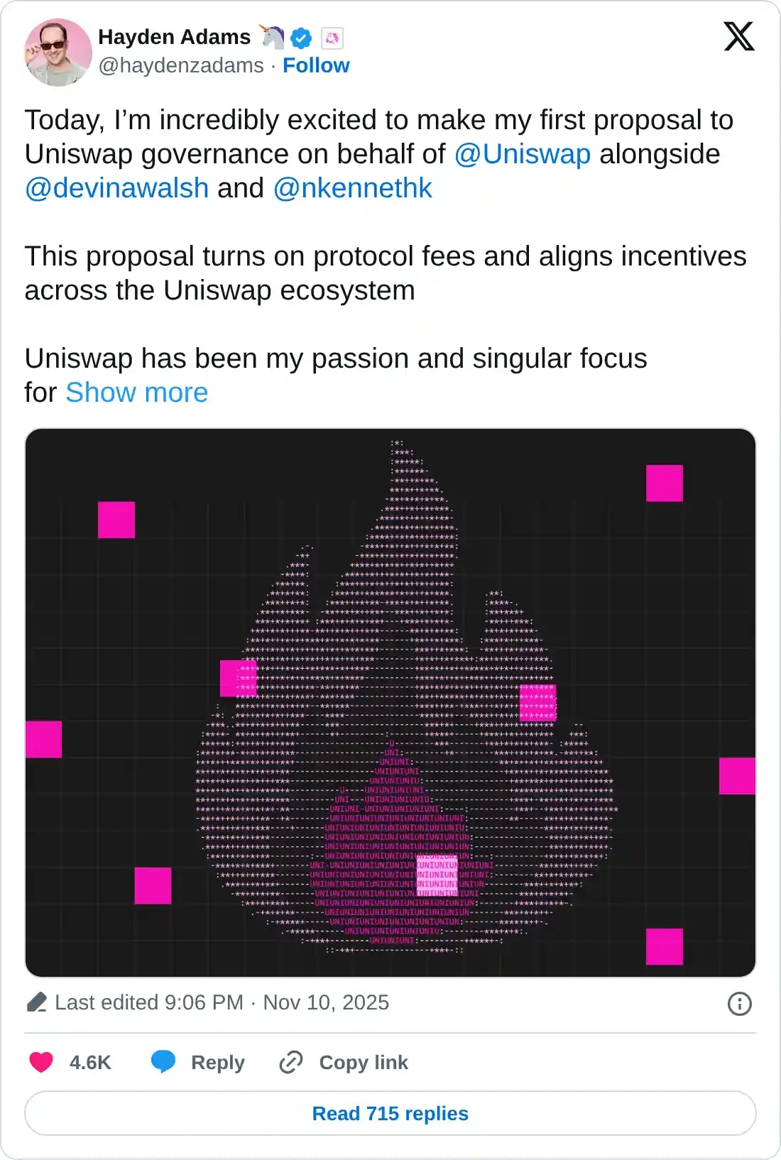 此外,“UNIfication”计划从金库中销毁1亿枚UNI,并将Unichain序列器费用重新分配用于同一用途。除了代币经济模型之外,该计划还引入了协议费用折扣拍卖和聚合器接口,旨在将Uniswap v4转型为能够从外部流动性来源收取费用的链上聚合器。Adams总结道:“这项提案为Uniswap未来十年的发展奠定了基础。”