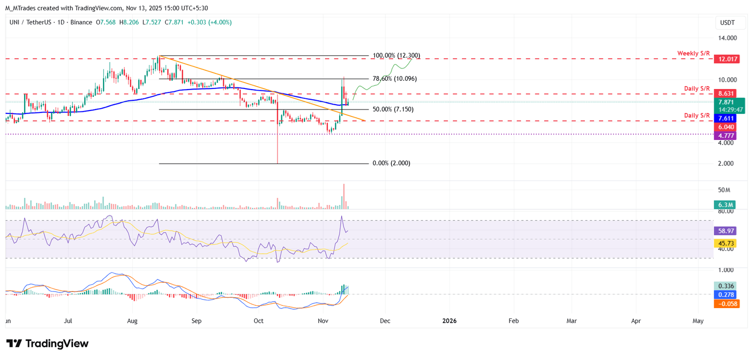 然而,UNI 的价格自周一的急剧上涨以来已经回落了近 20%,该代币目前在周四找到了支撑并稳定在 7.86 美元上方,这表明在下一轮上涨之前可能会出现短暂的停顿。