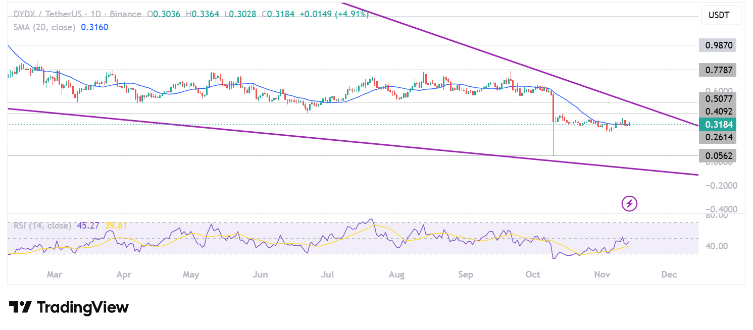 然而,随着 DYDX 代币经济基本面的看涨转变,这种重新崛起的 DEX 代币的前景可能会好转,其价格走势在 11 月 7 日获得了 20 日均线上方的生命线支撑。