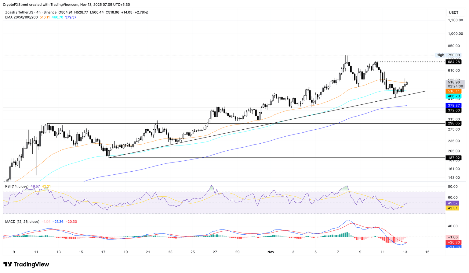截至发稿时,Zcash 周四交易价格高于 500 美元,从连接 10 月 17 日和 23 日低点形成的局部支撑趋势线反弹。ZEC 的反弹目标是周一的 684 美元高点,因为它已突破 50 周期指数移动平均线 (EMA)。