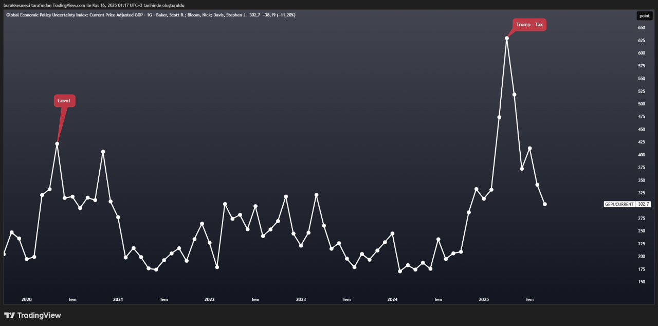 回想起来,只有一次这样的情况:以太坊实际上,该指数曾跌破这一水平。这种情况发生在2025年4月,当时特朗普时代的关税危机几乎冲击了所有全球资产。与此同时,全球经济政策不确定性指数(GEPUCURRENT)飙升至629点,甚至高于疫情期间的水平。