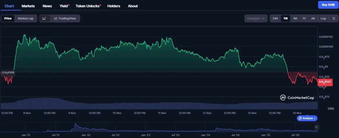“>ATH可能性有多大?虽然最近“梗币巨头”之一的柴犬币价格走势图一直呈红色。CoinMarketCap数据显示,SHIB价格仅在过去一周就从0.000010美元的高位跌至接近0.0000090美元。这延续了柴犬股的下跌趋势,其价格在30天时间框架内下跌了近15%。