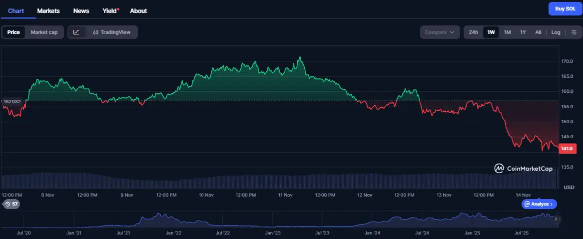 市值市值约为500亿美元——较目前的50亿美元大幅增长。这意味着SHIB股价需要大量新资金注入,短期内难以再创历史新高。Solana是以下成员之一十大山寨币虽然已列入买入名单,但其股价走势也经历了波动。值得注意的是,根据报告,Solana 的价格在过去七天内已从约 155 美元跌至近 140 美元。CoinMarketCap.