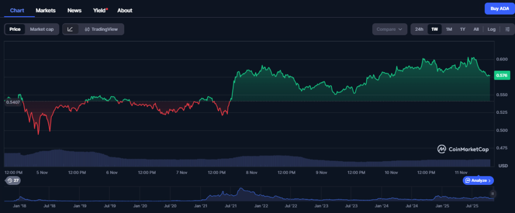 卡尔达诺 (Cardano) 是目前最值得购买的十大山寨币之一,价格也出现了反弹。根据一周图表显示,卡尔达诺的价格从约 0.50 美元上涨至超过 0.60 美元。CoinMarketCap.