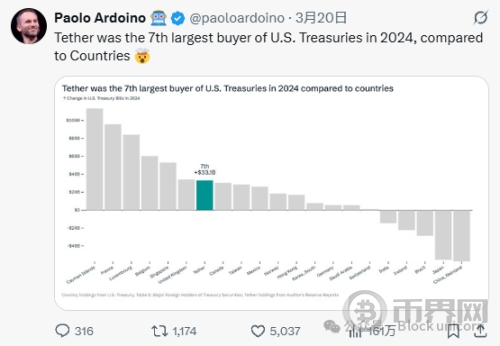 到 2024 年底,Tethe 当时已成为美国国债的第七大外国买家,在年度购买量上超过了加拿大和墨西哥等国家。