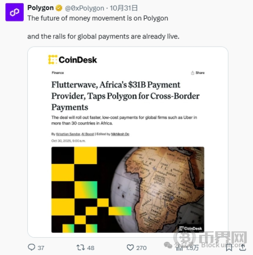 今年,非洲最大的支付处理商 Flutterwave(年交易额超过 400 亿美元)选择 Polygon 作为其在 30 多个国家 / 地区进行跨境稳定币结算的默认区块链。此次合作是历史上规模最大的稳定币实际部署之一,为 Uber 和 Audiomack 等主要客户的消费者和企业级交易流程提供支持。