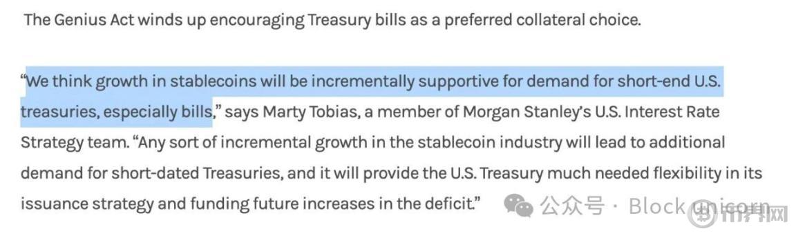 甚至摩根士丹利认为稳定币是一个增量投资机会。值得注意的是,这些代币的增长可能会提振对短期美国国债的需求,从而使财政部在弥补赤字和管理现金流方面拥有更大的灵活性。这些代币能够实现大额结算,例如银行间转账或贸易结算,几乎可以即时清算,其运作方式类似于数字现金账户。