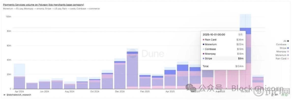 Polygon 的优势在于其多元化。全球最大的金融科技支付处理商 Stripe 目前通过 Polygon 集成,每月处理的交易额超过 800 万美元。Coinbase,MoonPay,Rain, 和 Paxos 所有这些都利用了 Polygon 的轨道进行稳定币和结算流动。