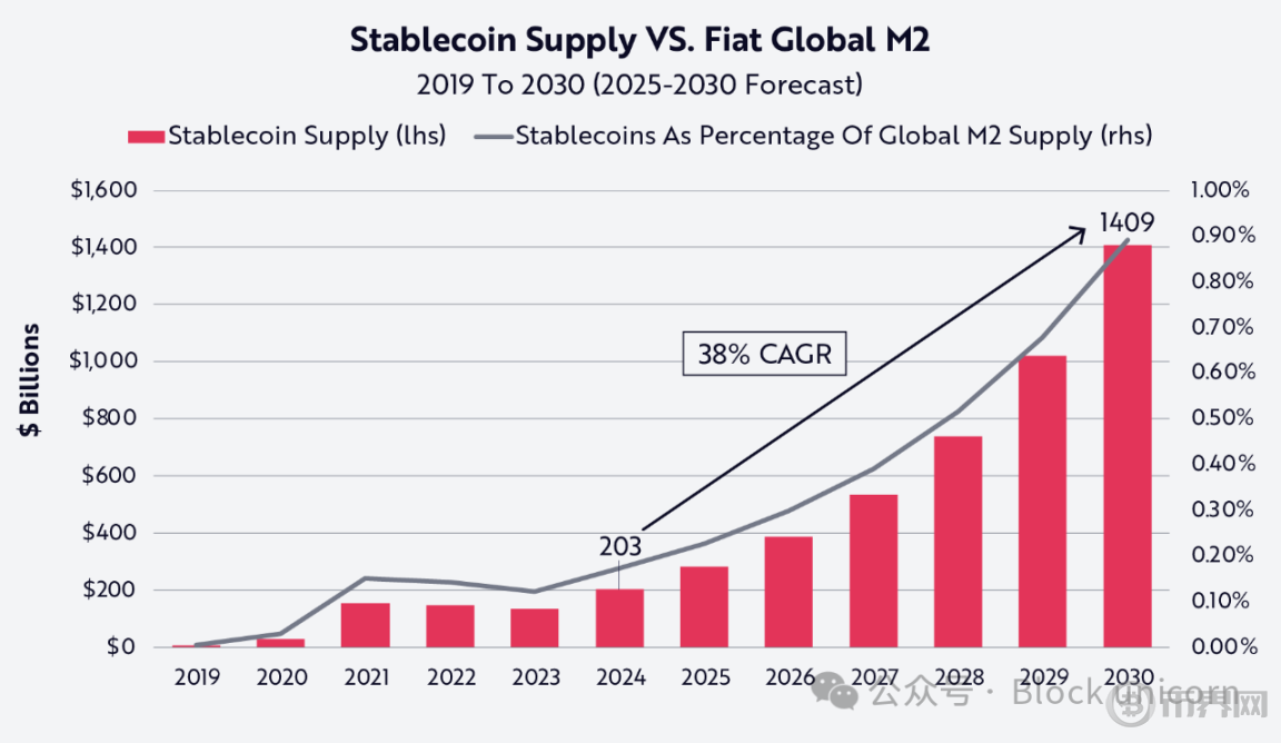 相比之下,全球稳定币市值约为 3000 亿美元,仅占美国 M2 货币供应量的约 1%。虽然绝对值仍然很小,但这种对比凸显了稳定币的快速增长及其巨大的扩张空间。稳定币实际上是运行在区块链上的数字美元,如果它们能够占据 M2 货币供应量的一小部分,其市场规模就可能达到数万亿美元,从而重塑支付、汇款和全球美元分配格局。