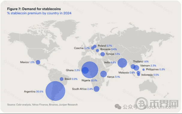 高通胀使得本地定价变得不可能。在阿根廷,约 62% 的加密货币交易活动集中在稳定币上,而 USDT 的交易价格一直高于官方美元汇率。