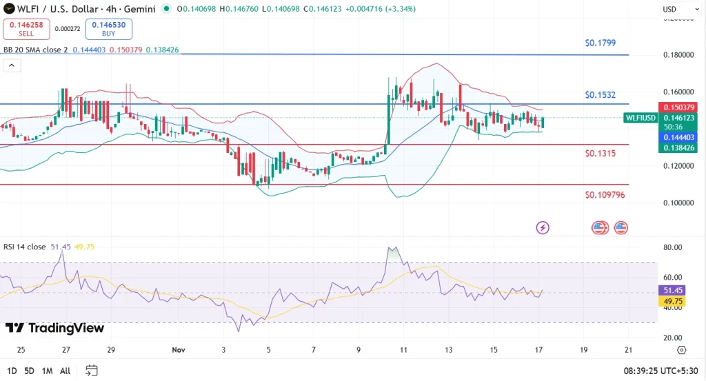 WLFI面临的下一个主要阻力是什么?下一个阻力位在 0.153 美元,该位置同时与 23.6% 的斐波那契回撤位和近期的价格回调位重合。若收盘价高于该水平,WLFI 有望进一步上涨至 0.18 美元。