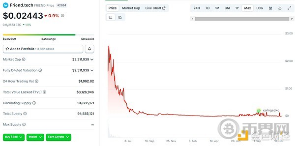 FRIEND 曾有出道即高峰的辉煌时刻,2024年5月,币价逼近3美元的历史高点,此后不断下滑,截至发稿报0.02443美元。