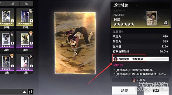 输出类角色的专属装备,能够大幅度加强技能效果,例如“厉雷驰骤”这一六星级的金色装备,能够加强角色“四枫院夜一”的技能效果,增强瞬哄形态时间,加强专属能力,在并未获取专属装备时,也可以直接搭配加强攻击倍率,和技能维持效果的下位装备。