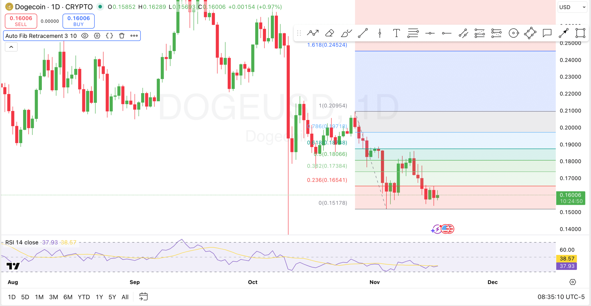 从技术层面来看,狗狗币的日线图显示其价格在关键支撑区域上方出现盘整迹象。截至分析时,狗狗币的交易价格约为 0.161 美元,低于 0.16541 美元的 0.236 斐波那契回调位,该回调位在过去几天一直起到阻力作用。