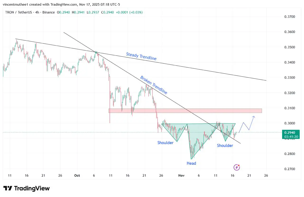 钱包市场活动和稳定的USDT资金流动继续支撑着看涨前景。Tron 的价格走势进一步勾勒出清晰的反向头肩形态,突破了持续数周的下降趋势线。这增强了市场对价格强劲反转的乐观预期。但 Tron 年底的走势会如何呢?