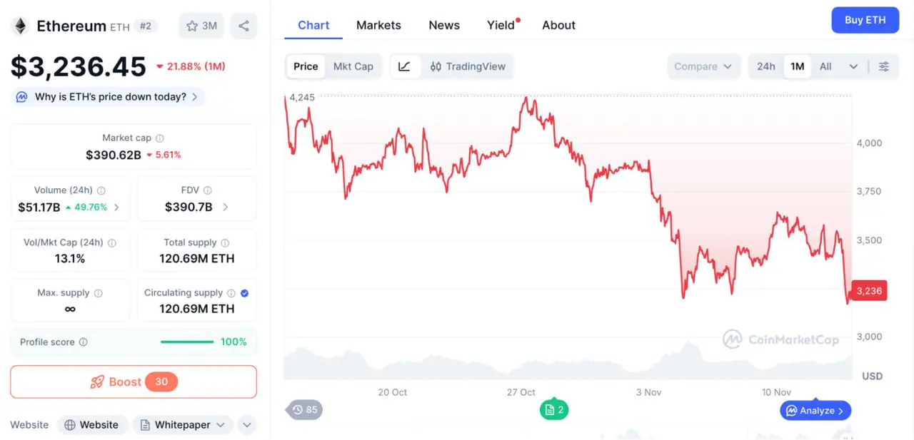 以太坊交易价格约为3,235 美元11月13日,多头将目标价位V型反弹至4100美元或更高,这将比当前水平上涨近20%。分析师他们认为,交易所供应量下降和以太坊 2000 亿美元的代币化经济是 12 月之前价格上涨的催化剂。
