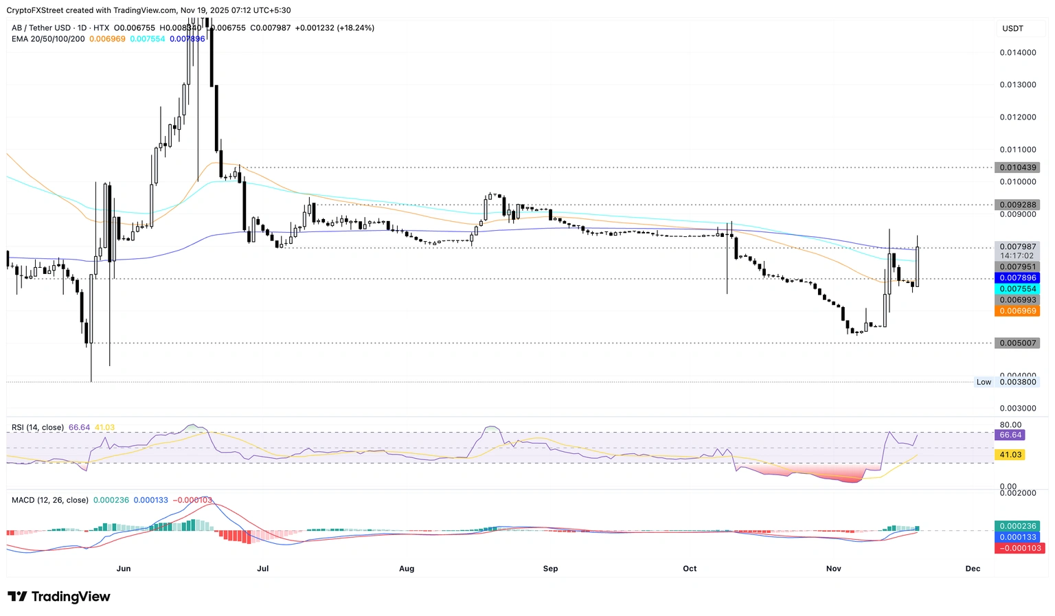 截至周三发稿时,AB 股价上涨 18%,试图守住 200 日均线 0.007896 美元上方。AB 的反弹抵消了上周五开始的连续五天超过 13% 的回调。