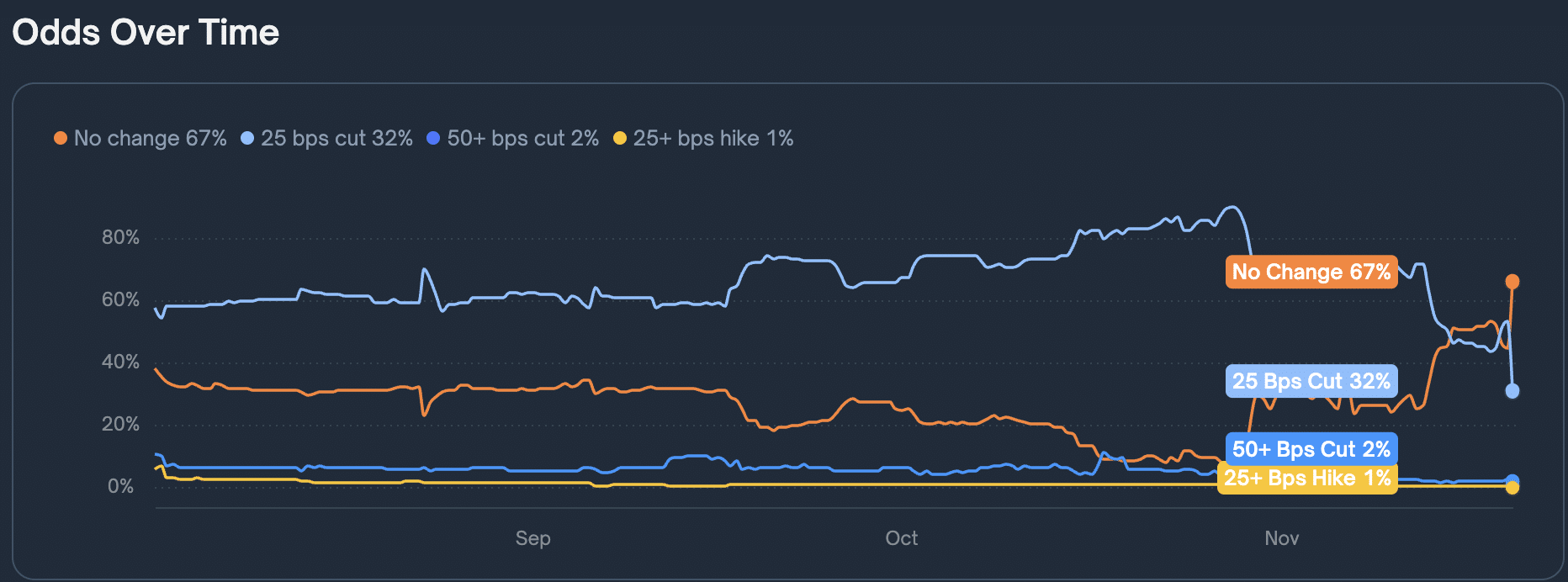 Polymarket赔率显示出迄今为止最明显的转变。交易员目前认为美联储12月维持利率不变的概率为67%,而降息25个基点的概率已骤降至32%。