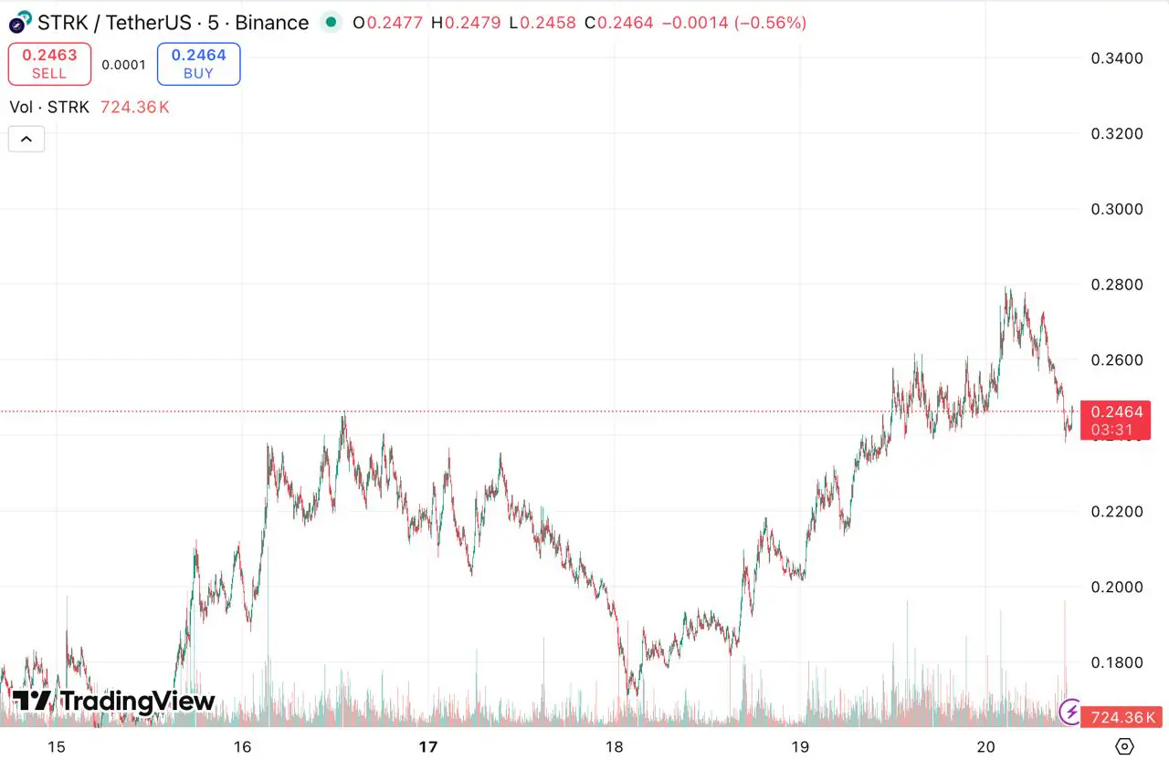 Starknet (STRK) 显示出强劲的看涨信号上升过去七天涨幅超过75%,跑赢大盘及同行。过去30天也保持了同样的增长势头,增幅达40%。