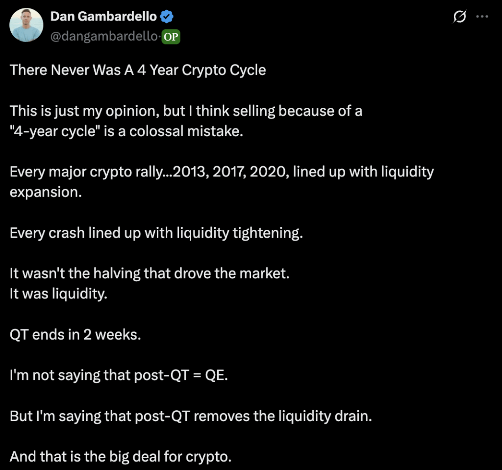 这位加密货币市场专家认为,遵循这种择时模式对投资者来说可能是一个“巨大的错误”。甘巴德罗的论点是,流动性周期而非减半事件才是加密货币市场走势的主要驱动力。