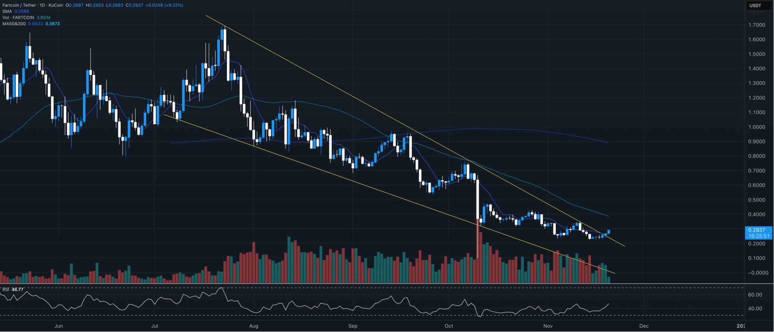 从图表上看,当模因币的价格突破了持续数月的下降通道时,出现了这波[飙升]。放屁币 [FARTCOIN]自 7 月下旬以来,该币种一直处于盘整状态,当时大多数山寨币在 2025 年都达到了峰值。