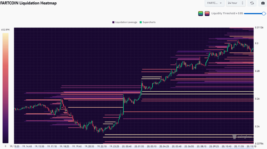 通常动态变化的流动性集群对这种上涨构成了威胁。价格触及 0.30 美元关口后,仓位开始在其下方形成,并向上延伸至 0.23 美元区域。