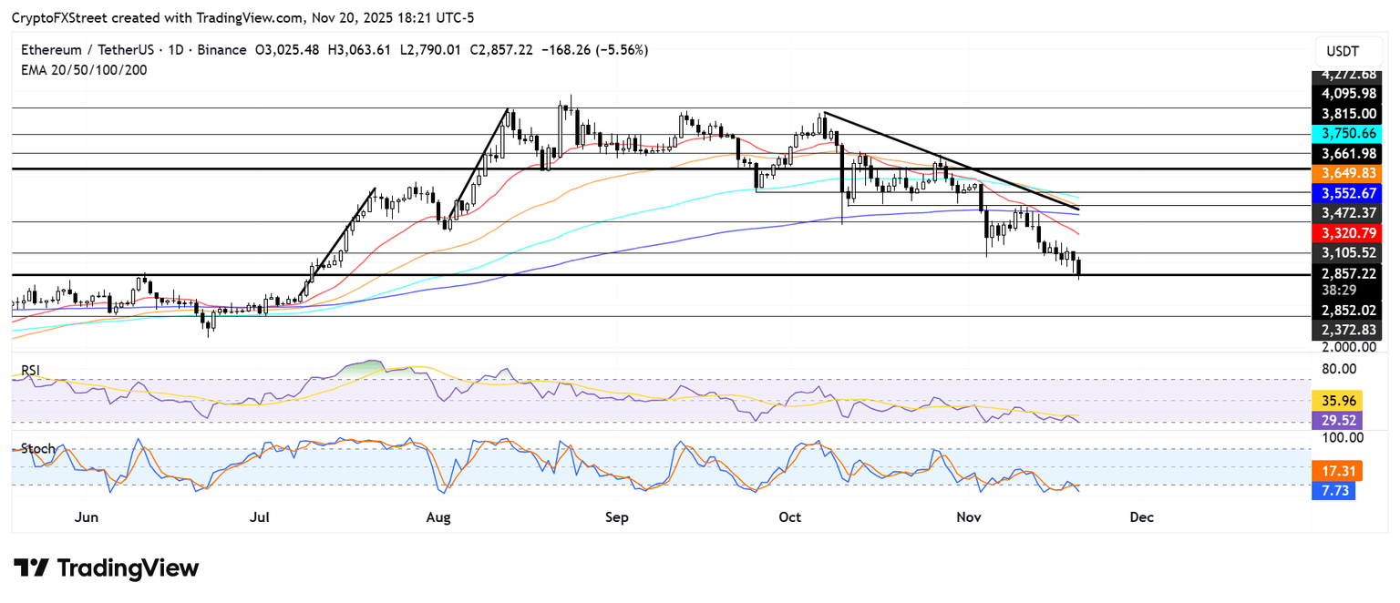 周四加密货币市场延续下跌趋势,以太坊(ETH)在2850美元附近的支撑位面临巨大压力。若跌破2850美元,ETH可能进一步下探至2300美元附近的支撑位。