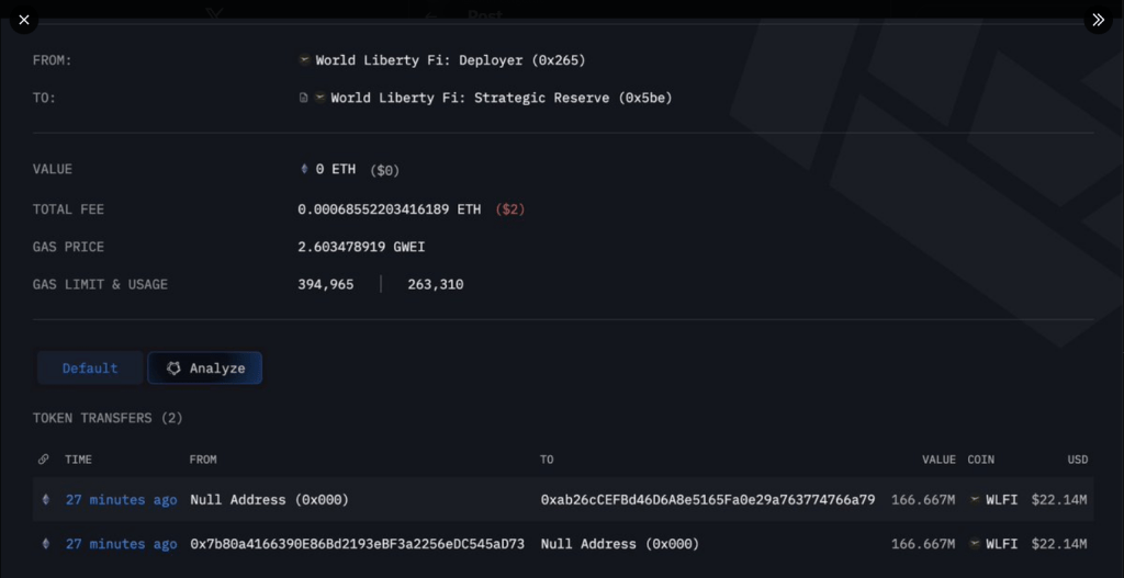 世界自由金融公司执行了一项紧急功能,燃烧了 166.667 兆升水。$WLFI从被盗用的地址中取出(2214 万美元),重新分配到恢复地址。