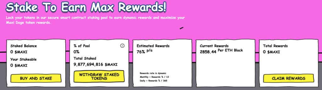 该项目迄今已筹集 420 万美元,在如此低迷的市场环境下,这着实令人印象深刻。原因很简单:Maxi Doge 将经典的模因币活力与实际的持有激励相结合。质押奖励高达约 420 万美元。年化收益率 76%这是狗狗币永远无法提供的。早期用户能够获得实际收益,而不是仅仅依赖于炒作。