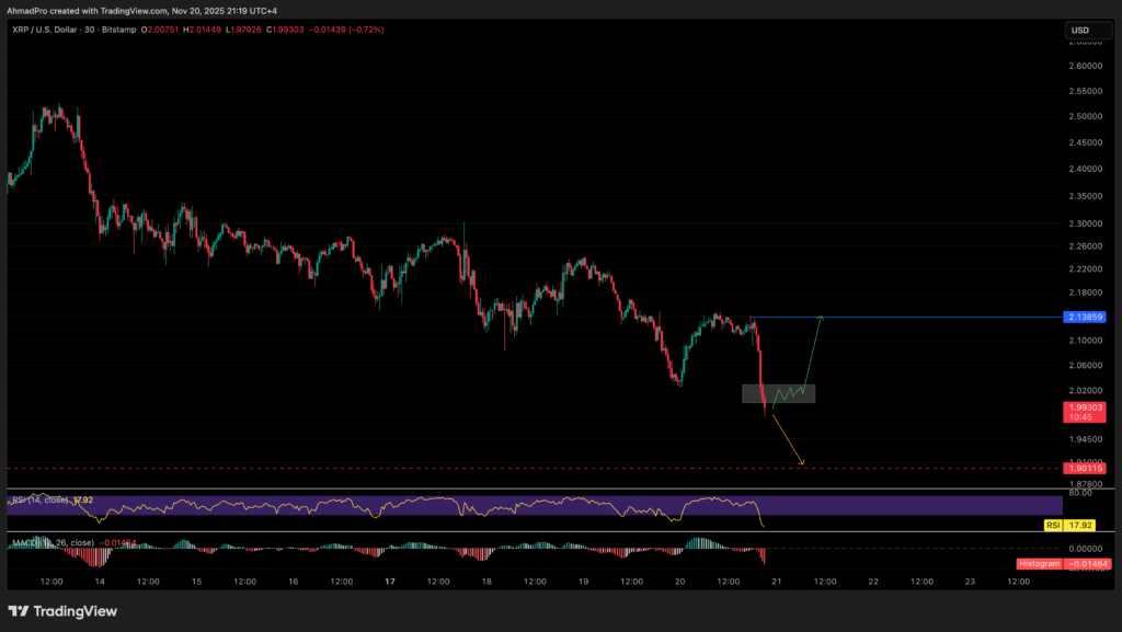 XRP 刚刚跌至新低。它在 2.00 附近的一个小需求区反弹,该区域基本上是支撑此次下跌的最后一个日内支撑区。下跌幅度剧烈且情绪波动。快速的影线反弹表明买家至少在试图守住这一区域。