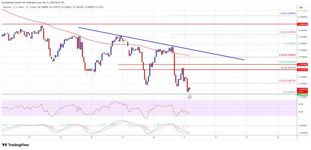 价格甚至一度跌破 0.150 美元。低点接近 0.1448 美元,目前价格已跌破从 0.1593 美元高点到 0.1448 美元低点下跌行情的 23.6% 斐波那契回撤位,并显示出看跌信号。此外,在 DOGE/USD 小时图上,一条阻力位在 0.1550 美元的下降趋势线正在形成。
