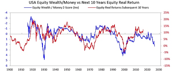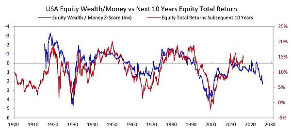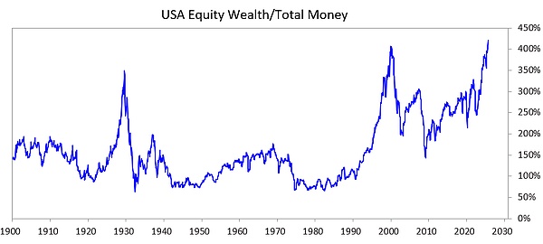 为了探究这种伴随巨大贫富差距而来的动态如何刺破泡沫,并导致一场可能在社会、政治和金融领域造成严重破坏的崩盘,我研究了下面的图表。该图展示了过去和现在的财富/货币差距,以及股票总市值与货币总量的比例。