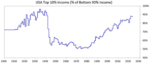 下图显示了收入最高的 10% 人群相对于收入最低的 90% 人群的收入占比——你可以看到现在的差距非常大。