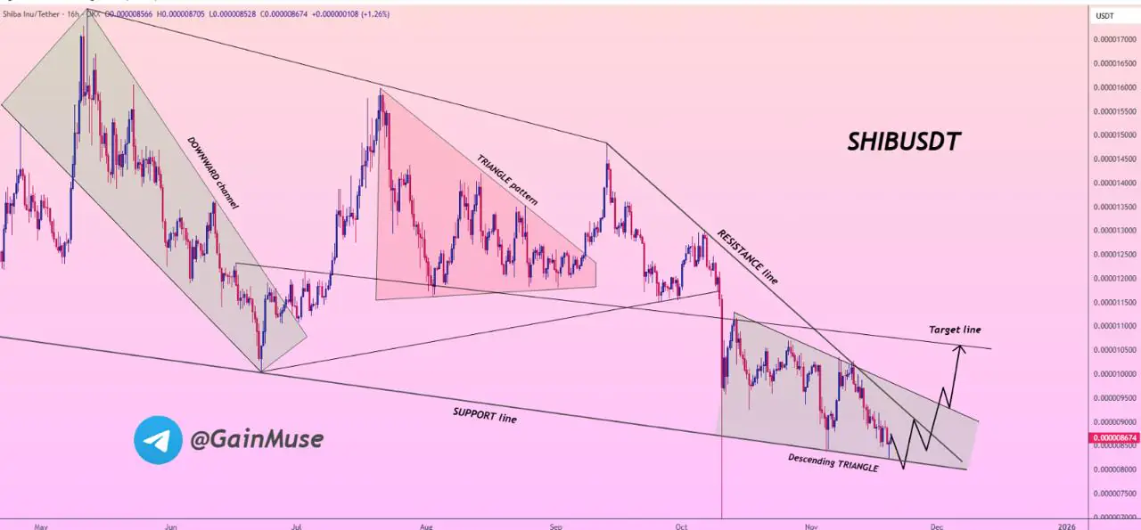 近期图表回顾分析师指出,下降三角形形态的重新测试结构已持续收紧数周。他们认为,0.0000090美元的需求区域是需要重点关注的区域。
