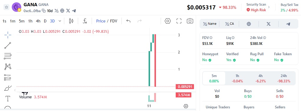 Gana项目的图表价格直线下跌,一根巨大的红色蜡烛线预示着抛售潮和恐慌情绪蔓延。这场突如其来的暴跌在几分钟内几乎抹去了该代币的全部价值。