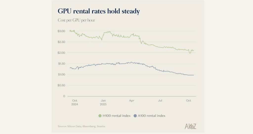 来自 a16z 的 Contra Burry笔记对老款、性能较低的 A100 GPU 的需求出人意料地保持得很好。