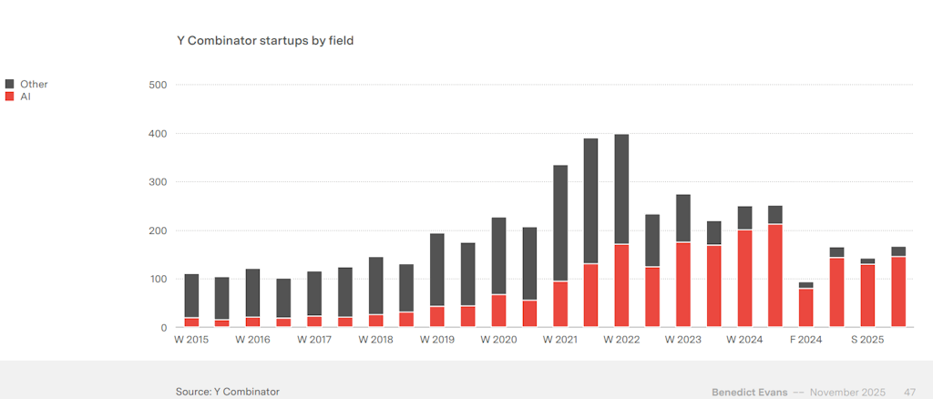 再次引用本尼迪克特·埃文斯的话,几乎所有 Y Combinator 的创业公司现在都与人工智能相关。