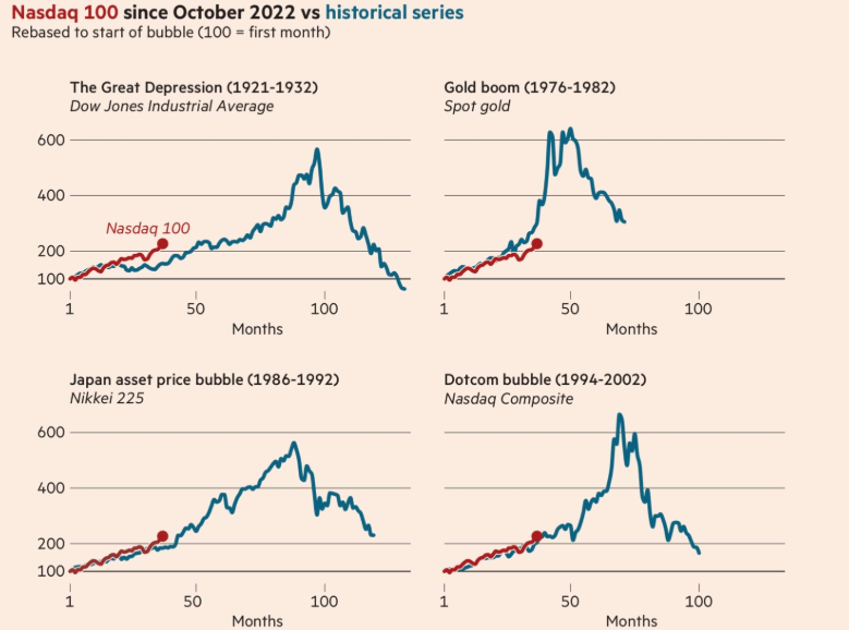 Emre Akcakmak 的叠加开始日期图表虽然可能有些武断,但他的图表确实指出了一个很好的观点:如果人工智能是一个泡沫,那么历史表明它可能会变得更大。