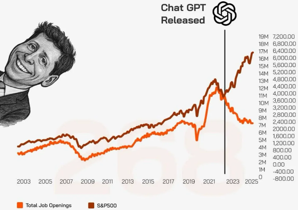 德里克·汤普森笔记从 ChatGPT 的起点来看,标普 500 指数一路飙升,而美国的职位空缺数量却大幅下降。我不确定这两者之间有多少因果关系,但这的确构成了一张非常精彩的图表。