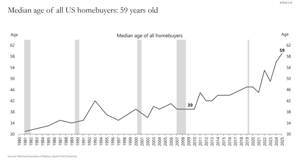 托斯滕·斯洛克指出,美国购房者的平均年龄高达……59——这真是个好消息,因为这让我感觉自己难得走在了时代的前沿。另一方面,作为一名比平均购房年龄年轻的购房者,我可以告诉你,拥有房产被高估了,而租房则被低估了。