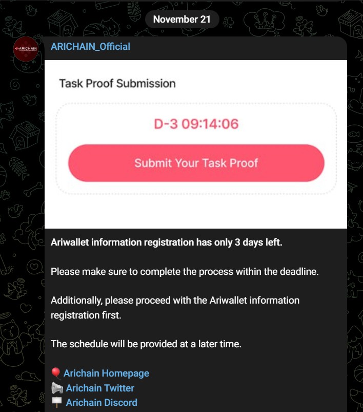 Arichain 也紧急呼吁用户在三天内完成 AriWallet 信息注册。提交注册信息是获得下一轮空投福利的关键,因为福利会及时发放。