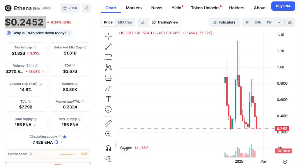 Ethena (ENA) 的交易价格约为截至2025年11月21日,价格为0.23美元至0.26美元。.