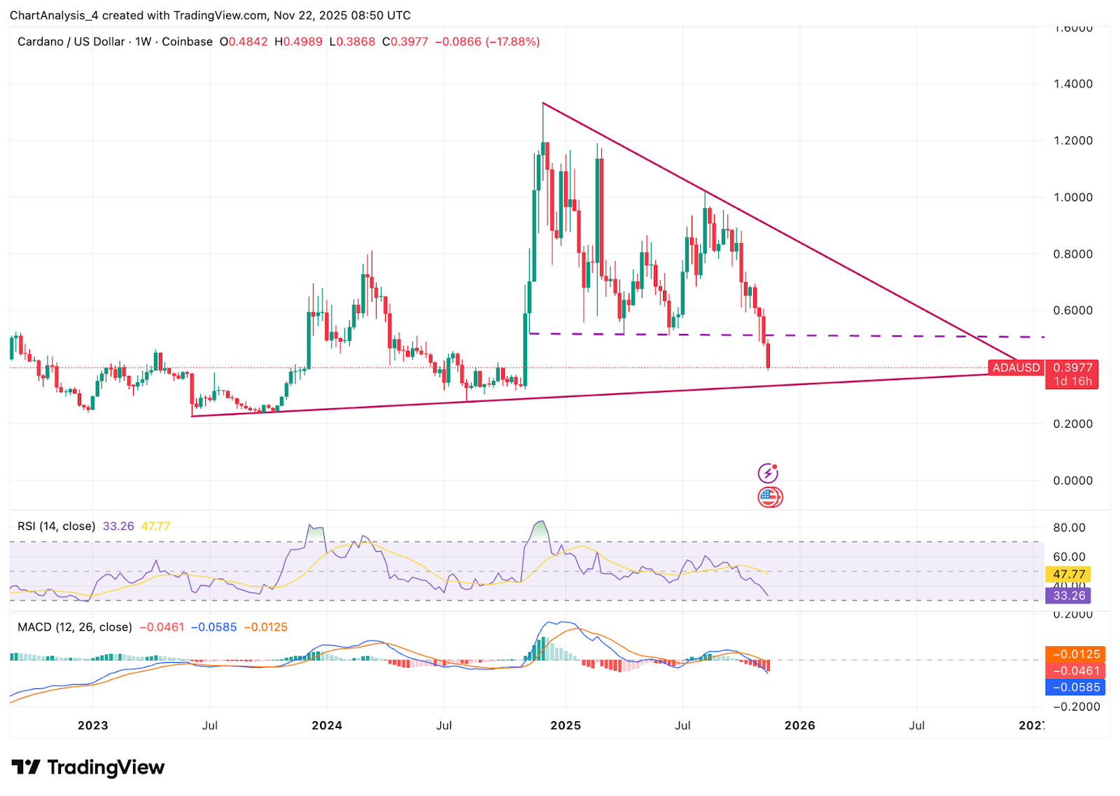 在周线图上,ADA 已彻底跌破 0.52 美元附近的水平支撑位,该价位在过去一年中多次起到支撑作用。当前这根K线已突破该区间,并触及始于 2023 年低点的上升趋势线。